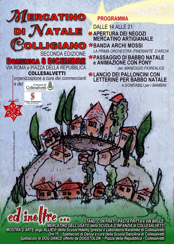 Collesalvetti – Un Babbo Natale che passeggerà tra le vie del paese; lo spettacolo itinerante degli “Archi mossi”; l’animazione con i pony del maneggio Fioralice e stand di dolci natalizi. È stato presentato stamani dal sindaco Bacci e dagli Assessori Tuci e Fantozzi il programma per la seconda edizione del Mercatino di Natale di Collesalvetti, previsto per domenica 8 dicembre dalle ore 14 in poi. Un evento ricco, con tante iniziative, a cui hanno collaborato l’Istituzione Comunale per la Cultura “Clara Schumann”, l’Svs, l’Associazione Arcobaleno e l’Associazione Carnevale Colligiano.