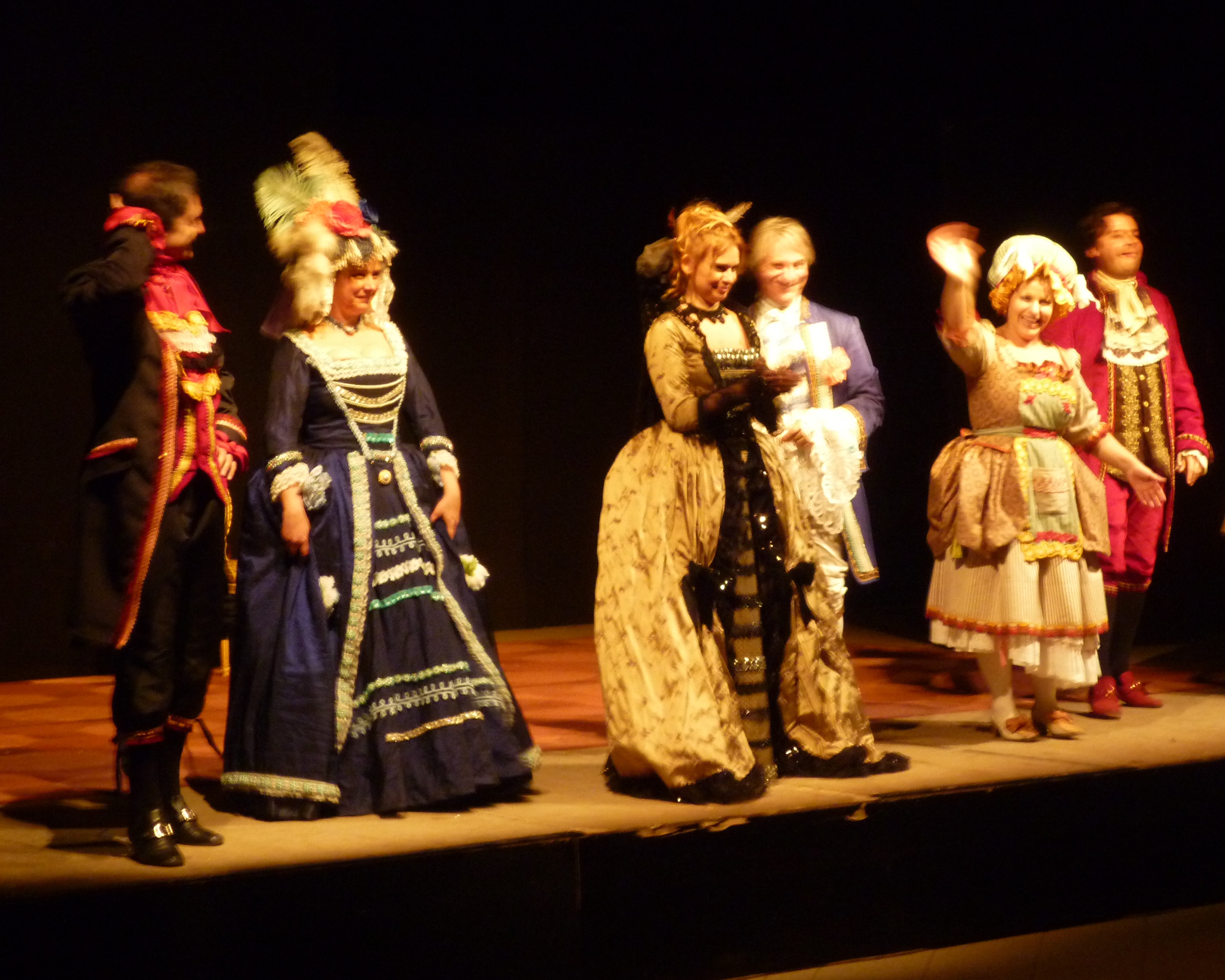 Entrando nel vivo della trama, il primo atto si apre con Rosaura (Debora Caprioglio), ricca vedova, che, in un monologo rivolto al pubblico, manifesta l’intenzione di rifarsi una vita dopo la scomparsa dell’anziano marito. Durante una festa danzante, la donna ha conosciuto quattro uomini decisi a farle la corte: l’inglese Milord Runebif (Riccardo De Francesca), il francese Monsieur Le Blau (Emanuele Barresi), lo spagnolo Don Alvaro de Castiglia (Fabrizio Brandi) e l’italiano Conte di Monte Nero (Michele Crestacci). Al fianco della giovane ereditiera troviamo la serva Marionette (Daniela Morozzi), francese d’origine, che cerca di spingere la padrona verso il suo connazionale.