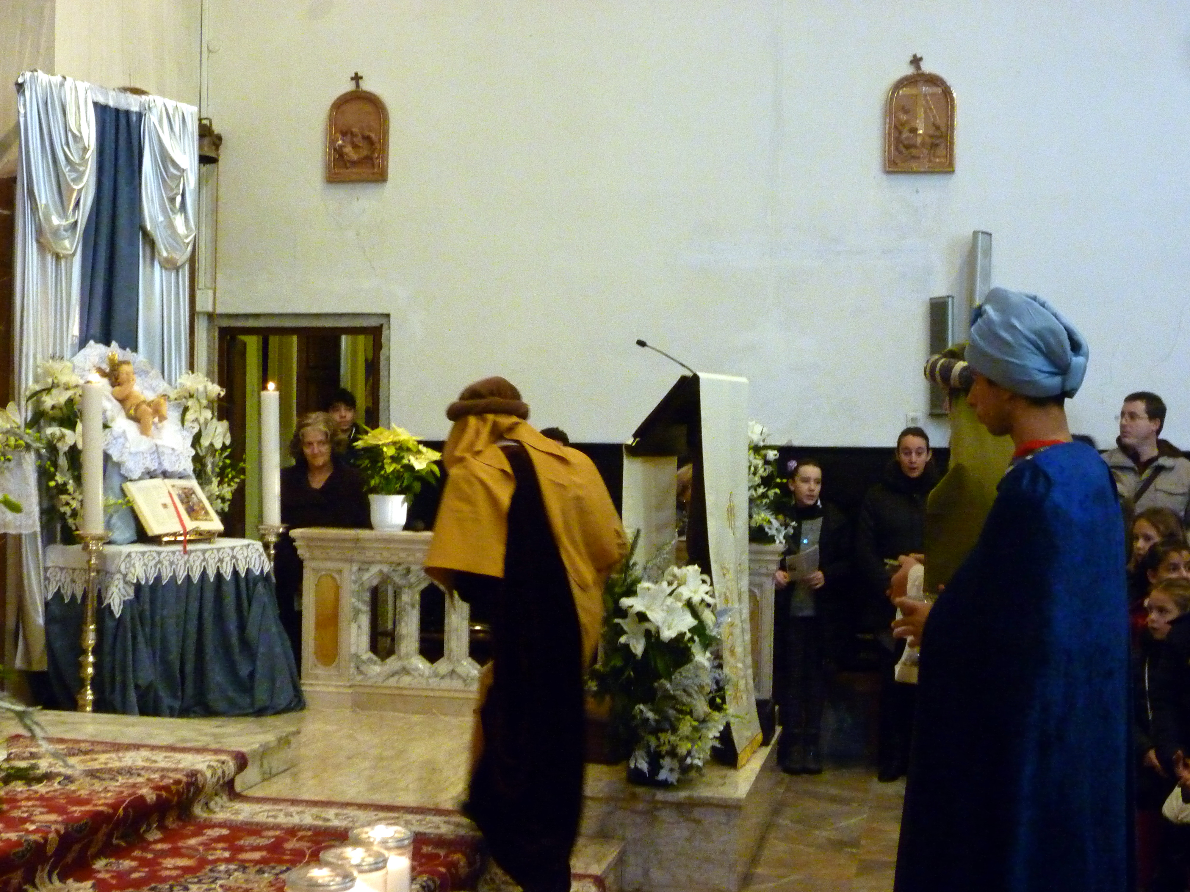 Messa che si è aperta prima con la consueta benedizione di Don Massimo. Poi, è stata la volta dell’ingresso dei Magi (seguiti da altri figuranti in costume) che, dopo aver percorso la navata centrale, hanno posato i loro doni (oro, incenso e mirra) sotto la culla di Gesù Bambino posta sull’altare. Durante la seconda parte della funzione, i bambini hanno consegnato i propri doni a Magi ed hanno ricevuto un dolcetto come simbolo di questa ricorrenza. La cerimonia si è infine conclusa con l’omaggio dei fedeli a Gesù Bambino.