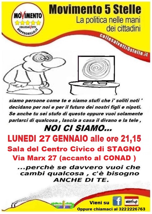 Stagno – Proseguono le Assemblee Pubbliche del Movimento 5 Stelle sul Comune di Collesalvetti. Stasera, alle 21:15, presso la Sala del Centro Civico in Via Marx n° 27, i pentastellati incontreranno la cittadinanza di Stagno. Lo scopo, per gli organizzatori dell’evento, è far conoscere ai cittadini il Movimento che fa capo a Beppe Grillo, ma non solo. «Vogliamo – ci rende noto una fonte del Movimento – dar modo a chi vuole di intervenire ed esporre una problematica inerente la frazione o, più in generale, il territorio comunale perché siamo più propensi a parlare delle buche nelle strade e dei lampioni spenti, solo per fare un esempio, che della legge elettorale. Noi pensiamo – prosegue – che il cittadino non possa più delegare a qualcun altro la soluzione dei problemi e delle carenze del territorio; la gente deve riappropriarsi della propria vita, sentirsi parte del territorio nel quale vive e farsi avanti in prima persona per migliorare le cose che condivide con gli altri». A febbraio, i pentastellati faranno tappa anche a Collesalvetti e Vicarello.