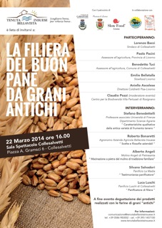 LocandinaA3_BellavistaInsueseCollesalvetti – La filiera del buon pane da grani antichi. Si parlerà di questo domani, sabato 22 marzo, alle 16, alla Sala Spettacolo di Collesalvetti. In un panorama alimentare dominato dai derivati del frumento, la questione della qualità è di primaria importanza. Ecco allora che la riscoperta dei grani “antichi” potrebbe essere la soluzione. Il recupero delle cultivar è dunque il primo passo da compiere per riscoprire l’importanza di una sana alimentazione, è necessario però anche un secondo e fondamentale passaggio: la filiera corta. La passione, la condivisione di ideali e la voglia di sperimentare hanno portato dunque all’incontro della materia prima di qualità con colui che sa trasformarla, rispettarla ed utilizzarla. L’iniziativa è patrocinata dal Comune di Collesalvetti e dalla Provincia di Livorno, in collaborazione con Slow Food Livorno, il Centro per la biodiversità alimentare Villa Pertusati e il Panificio Luschi di Collesalvetti. Un’occasione per condividere la bellezza di percorrere una vecchia strada che si rinnova mentre se ne aprono di nuove. Fra i partecipanti: il Sindaco, Lorenzo Bacci; l’Assessore all’Agricoltura del Comune di Collesalvetti, Benedetto Tuci; il suo omologo provinciale, Paolo Pacini; Emilio Bellatalla (Slowfood Livorno); Aniello Ascolese (Direttore della Coldiretti di Pisa-Livorno) e Claudio Pozzi (Centro per la Biodiversità di Villa Pertusati di Rosignano), che farà da moderatore per l’evento.