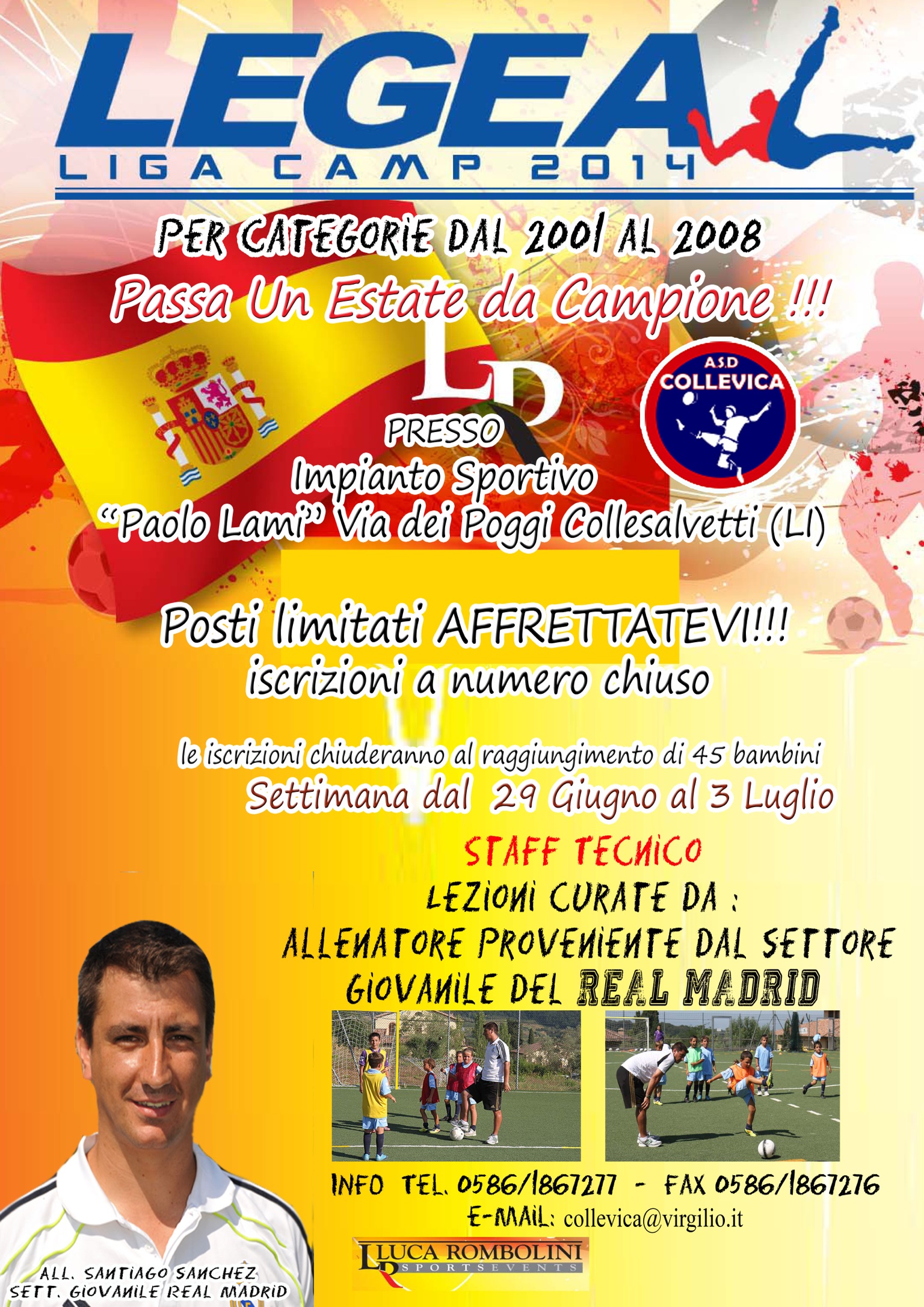 Collesalvetti Dal 29 giugno al 3 luglio, presso il campo sportivo “Paolo Lami”, avrà luogo il Legea Liga Camp 2014 per la zona di Livorno, organizzato dal marchio Legea in collaborazione con l’Asd Collevica. Questa iniziativa è rivolta alle categorie dal 2001 al 2008 e a condurre gli allenamenti sarà Santiago Sanchez, allenatore proveniente dalle giovanili del Real Madrid.