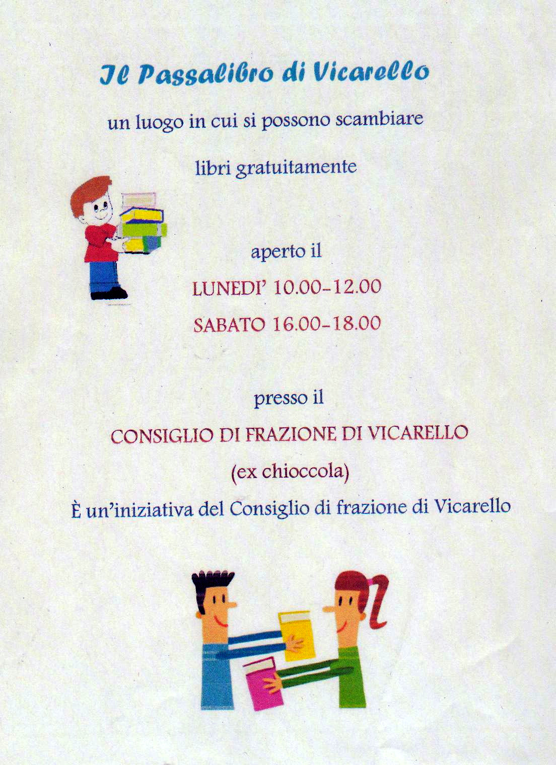 Vicarello «Prendi un libro e quando lo hai finito, invece che riportarlo, lo lasci su una panchina, così che qualcun altro possa leggerlo». Queste le parole utilizzate da Angela Maria Burgalassi per riassumere lo spirito del “Passalibro”, iniziativa nata circa un anno fa grazie al Consiglio di Frazione. Molti i libri lasciati nella sede della Sala delle Colonne da numerosi vicarellesi. Ma il “Passalibro” non è una biblioteca. La persona che si reca lì può prendere un libro gratuitamente e scegliere anche di non riportarlo. Infatti, lo scopo è di promuovere la diffusione e la condivisione della cultura. Gli orari di apertura sono il lunedì dalle 10 alle 12 e il sabato dalle 16 alle 18. Qualche cittadino, tra cui qualche componente del Consiglio di Frazione, si occupa di mandare avanti questa iniziativa: «Purtroppo – afferma Burgalassi – ci vorrebbe una gestione esclusiva composta da un maggior numero di persone».