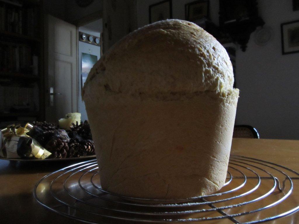Preparazione Fare un panetto con il lievito sciolto con poco latte tiepido e 200 gr farina: quando comincia a lievitare aggiungere agli altri ingredienti nell’impastatrice per il pane (altrimenti lavorare a mano a lungo). Far lievitare nello stampo da panettone, imburrato e infarinato. Quando il volume è raddoppiato, far cuocere in forno a 180° per 40′. Si serve freddo,per antipasto, con salumi affettati.