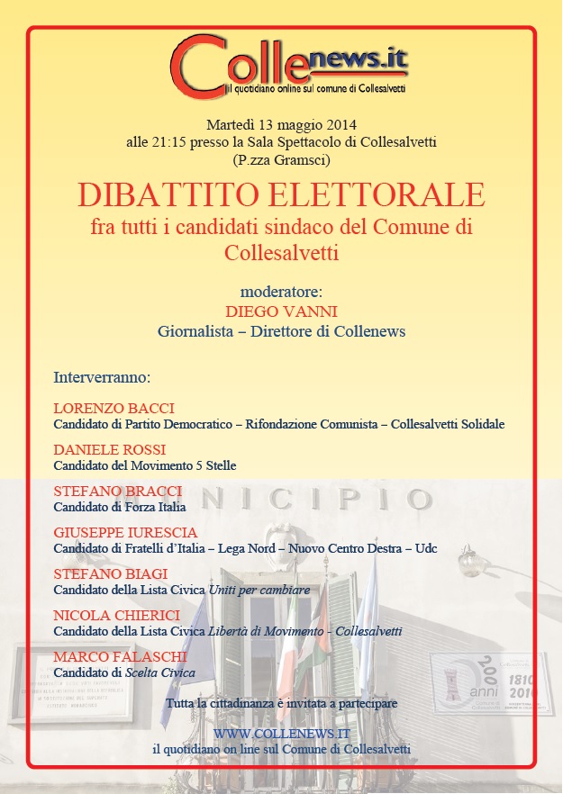 Seduti sul palco ci saranno dunque Lorenzo Bacci (candidato di Partito Democratico; Rifondazione Comunista; Comunisti Italiani e Collesalvetti Solidale); Daniele Rossi (candidato del Movimento 5 Stelle); Stefano Bracci (candidato di Forza Italia); Giuseppe Iurescia (candidato di Fratelli d’Italia; Lega Nord; Nuovo Centro Destra e Udc); Stefano Biagi (candidato della Lista Civica Uniti per cambiare); Nicola Chierici (candidato della Lista Civica Libertà di Movimento – Collesalvetti) e Marco Falaschi (Candidato di Scelta Civica). L’ingresso è ovviamente gratuito.