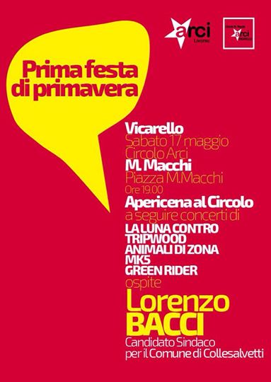 staseraVicarello Un’apericena e dei concerti. E’ quanto in programma per questa sera al Circolo Arci di Vicarello. L’appuntamento è per le 19:00 in Piazza Macchi. All’evento sarà ospite il candidato sindaco del centrosinistra, Lorenzo Bacci. Ad esibirsi, dopo l’apericena, La luna contro; I Tripwood; gli Animali di zona; gli MK5 e i Green rider.
