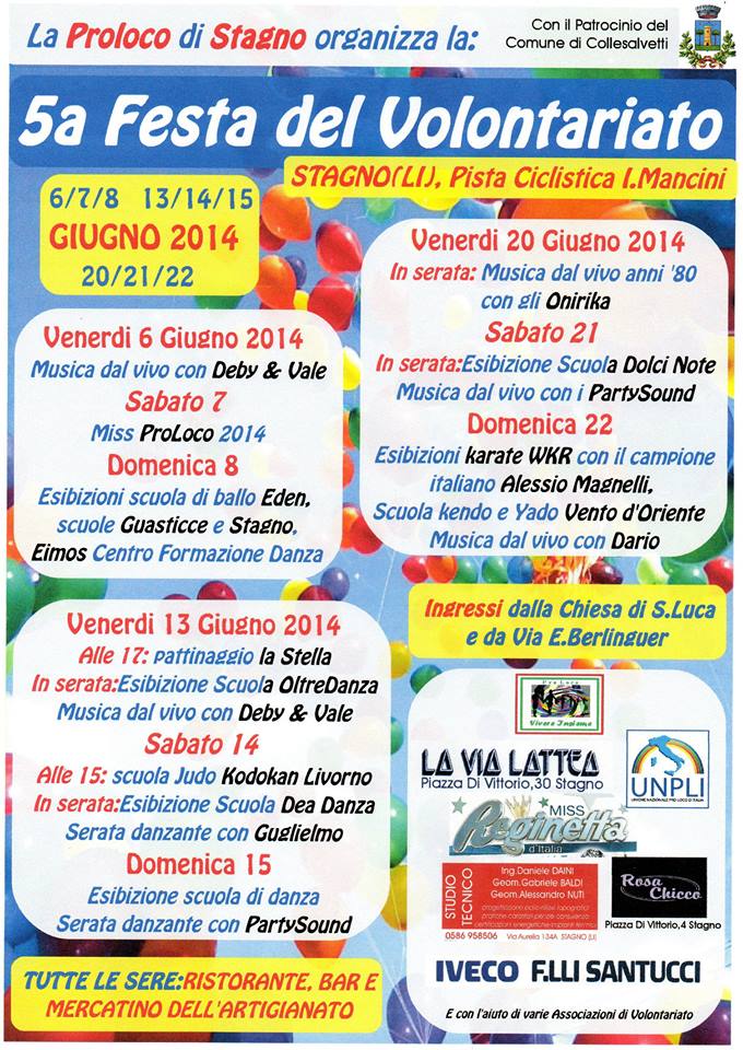 Stagno Da venerdì, alla pista ciclistica “Ivo Mancini”, ha avuto inizio la Quinta “Festa del volontariato”. Organizzato dalla PRO LOCO “Vivere Insieme” di Stagno, l’evento ha visto fin dalla sua prima serata un numero piuttosto importante di partecipanti. Presenti oltre centociquanta person, alla serata, che ha visto la prima presenza, delle due in programma, di “Deby e Ale”; un duo di musicisti da sala, che hanno intrattenuto il pubblico per tutta la serata di apertura.