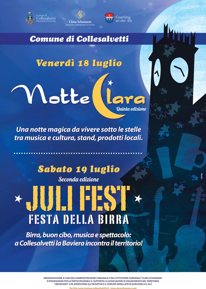 Collesalvetti Per il quinto anno consecutivo va in scena, a Collesalvetti, la Notte Clara, un’occasione per tutti i colligiani per festeggiare insieme il 70° anniversario della Liberazione di Collesalvetti. La festa proseguirà sabato 19 luglio, in Piazza della Repubblica con la July Fest, la festa della birra per festeggiare insieme l’amicizia con il Comune di Garching a.d. Alz, gemellato col Comune di Collesalvetti. Programma e modifiche alla circolazione nell’articolo.