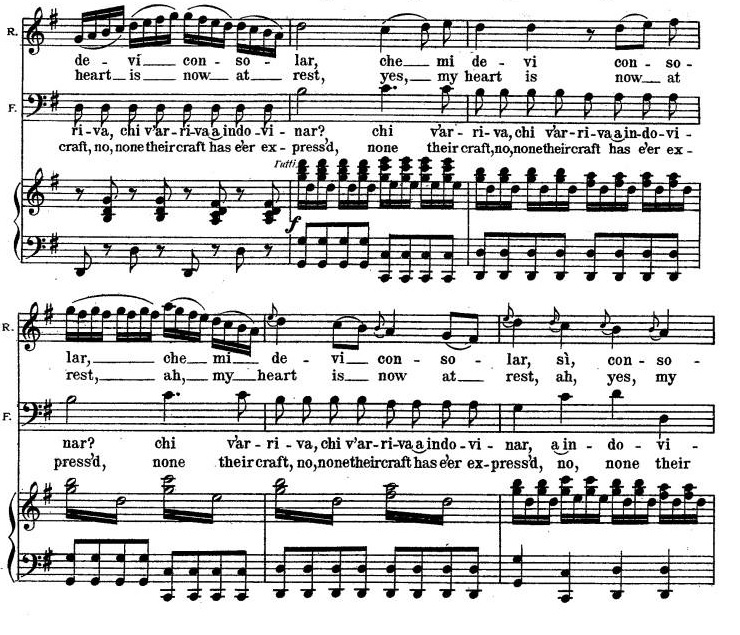 DUETTO Diversamente dall’aria, il duetto è un brano, come suggerisce il nome stesso, interpretato da due voci solistiche. La bravura del compositore, nei duetti (ma anche negli altri pezzi d’insieme) sta nell’assegnare ai due cantanti due linee melodiche indipendenti l’una dall’altra, cosa che in musica si chiama contrappunto. Un celebre esempio di duetto, per citare ancora una volta il Barbiere è Dunque io son nel quale le linee melodiche di Figaro e Rosina, soprattutto, nella parte finale, si intrecciano nella loro diversità, come si vede, anche graficamente, nello spartito (vedi foto) ai pentagrammi contrassegnati dalle lettere F e R (Figaro e Rosina, appunto).