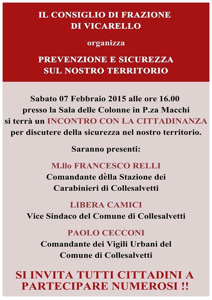 Vicarello Un incontro per la prevenzione e la sicurezza sul territorio. E’ quanto organizzato dal Consiglio di Frazione di Vicarello per domani, sabato 7 febbraio, alle 16 presso la Sala delle Colonne di Piazza Macchi.