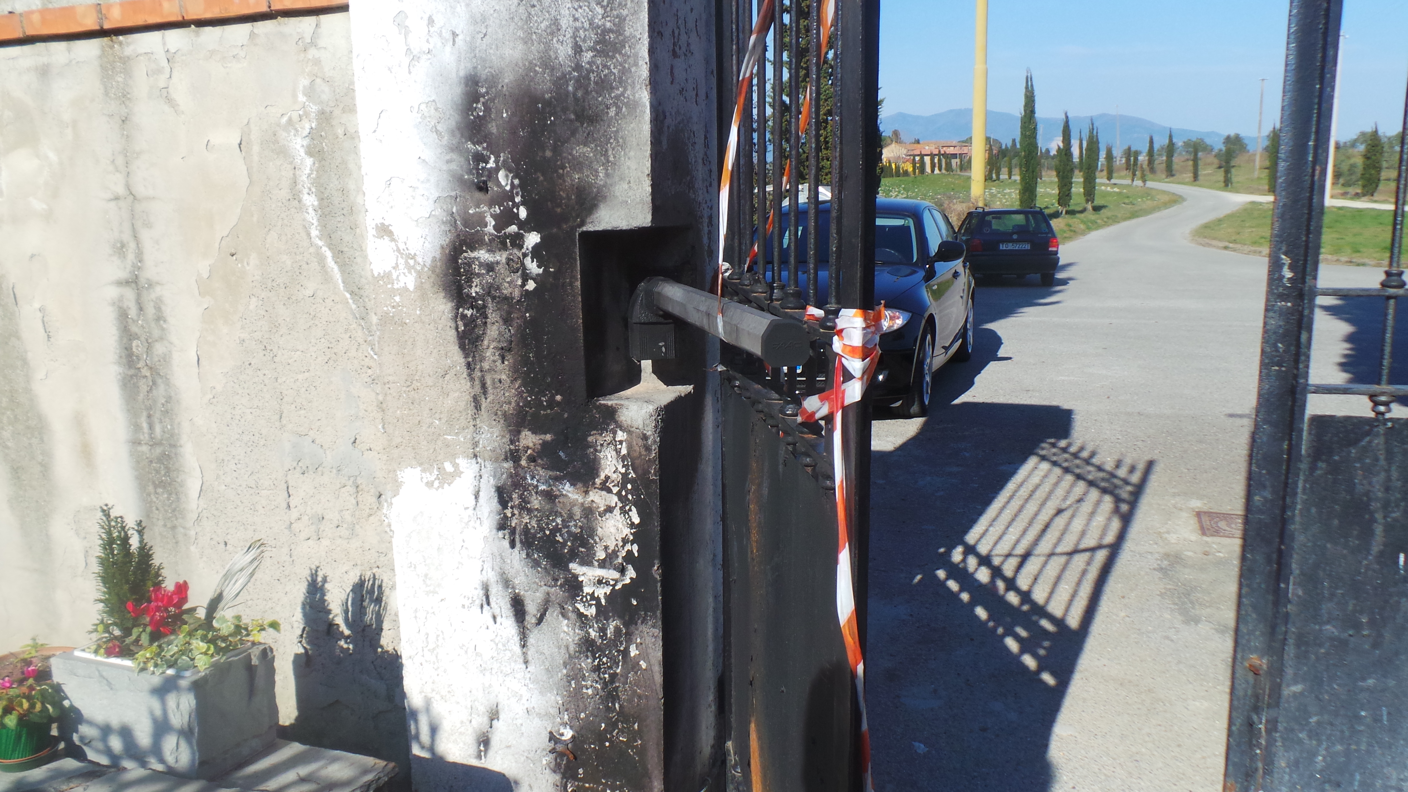 IL SISTEMA AUTOMATICO DEL CANCELLO É DISTRUTTO La prima cosa che chi entra nel camposanto nota è ovviamente il cancello, il cui sistema automatico di apertura e chiusura è andato completamente distrutto, si presume per un guasto al sistema elettrico di apertura che ha causato un corto circuito nella scatola della centralina, che è stata completamente distrutta dalle fiamme, come testimonia l’evidente bruciatura che sale su per la colonna portante del cancello stesso.