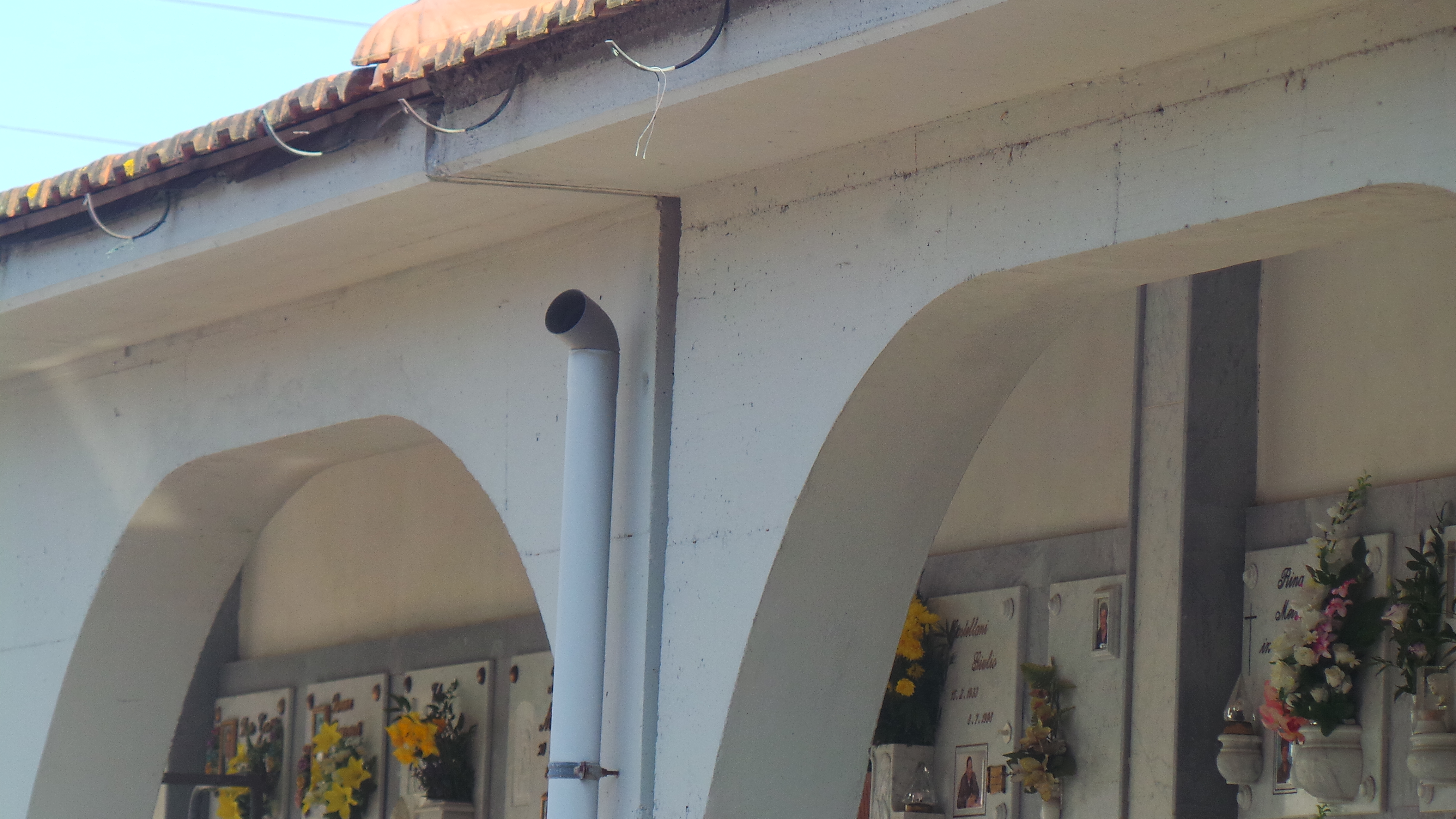 GRONDAIE RUBATE Spostandosi sulla sinistra, verso il lato che costeggia il prosieguo della strada, si nota come le parti orizzontali delle grondaie siano state rubate, mentre (come si vede da foto a lato) i pluviali (e cioè le sezioni verticali della grondaia) sono ancora là, anche se nell’impossibilità di svolgere la loro funzione, mancando la parte orizzontale che per prima raccoglie le acque piovane. Il risultato è che l’acqua, dal tetto a spiovente, va a finire direttamente sulle tombe a terra poco distanti. Le grondaie, a onor del vero, sono state oggetto di furto anche in tutti i cimiteri e le scuole del Comune.