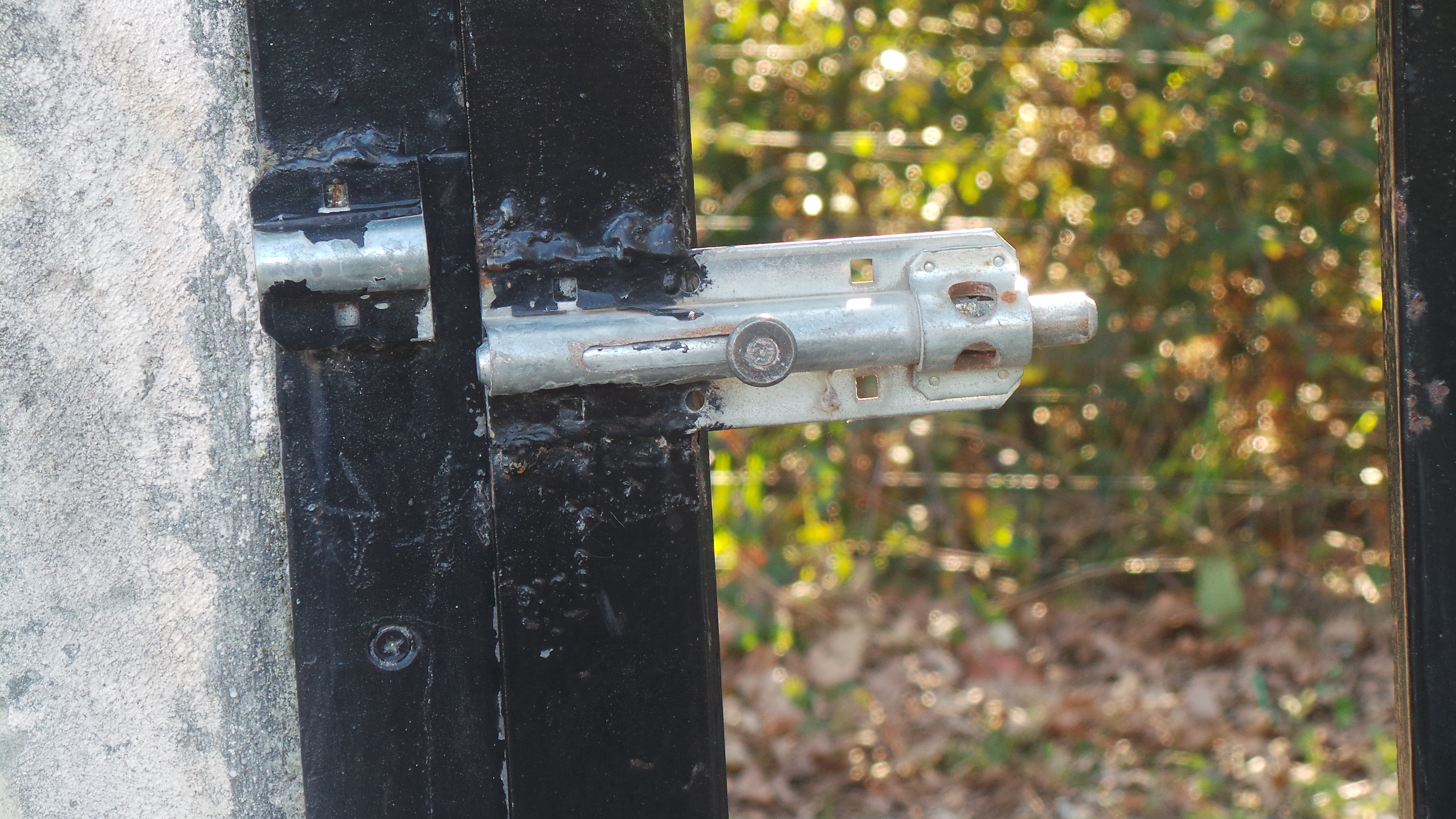 E se il cancello dell’entrata/uscita principale versa in cattive condizioni, quello dell’uscita di emergenza non è da meno. Gli utenti del cimitero lamentano anzitutto che l’apertura sia a tirata verso l’interno e non a spinta verso l’esterno come le porte antipanico. Oltre a questo, la chiusura col paletto non è in asse (come si può vedere in foto a lato) e per questo il cancello è “chiuso” mediante un blocco di cemento (vedi foto a fondo articolo). Peraltro, anche qualora funzionasse la chiusura col paletto perché in asse, essa sarebbe apribile anche dall’esterno, essendo le sbarre del cancello a larga distanza l’una dall’altra (più di quanto basta per farci passare una mano). Lo stesso sistema automatico di apertura/chiusura del cancello di ingresso principale, qualora funzionasse, sarebbe così bypassato.