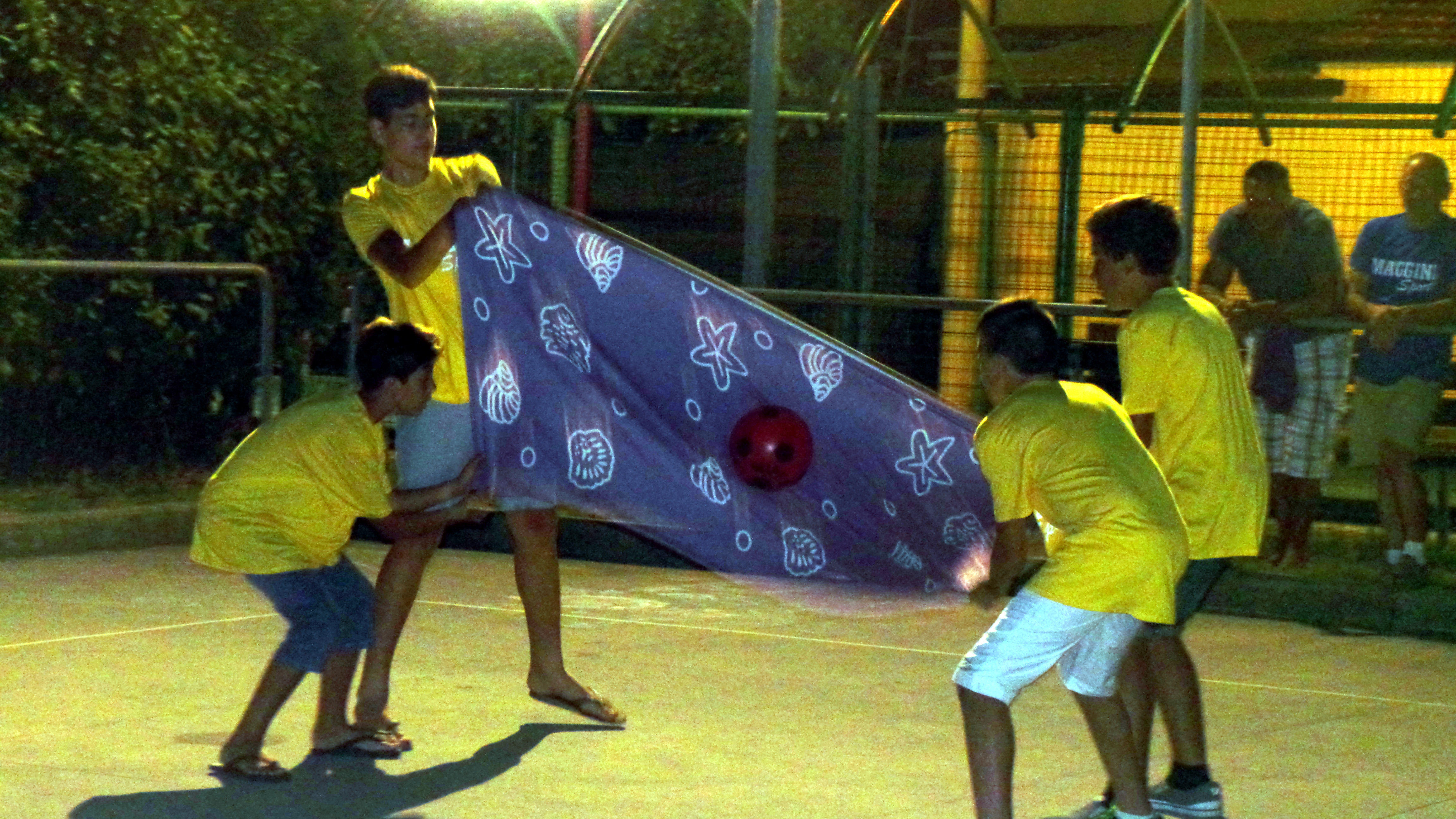 Un gioco simile alla pallavolo, con la palla che va lanciata nel campo avversario, ma… da un telo, appunto, i cui 4 lembi sono sorretti dagli altrettanti giocatori della squadra. E se da telo la palla si lancia, attraverso la sinergia del gioco di squadra, da telo va pure ricevuta. Otto braccia e otto gambe che devono lanciare e ricevere coordinandosi per far punto. Un gioco, insomma, che ben educa alla cooperazione, al gioco di squadra appunto, nello spirito di tutte le iniziative che si svolgono al bocciodromo, sempre all’insegna dello stare insieme in allegria.