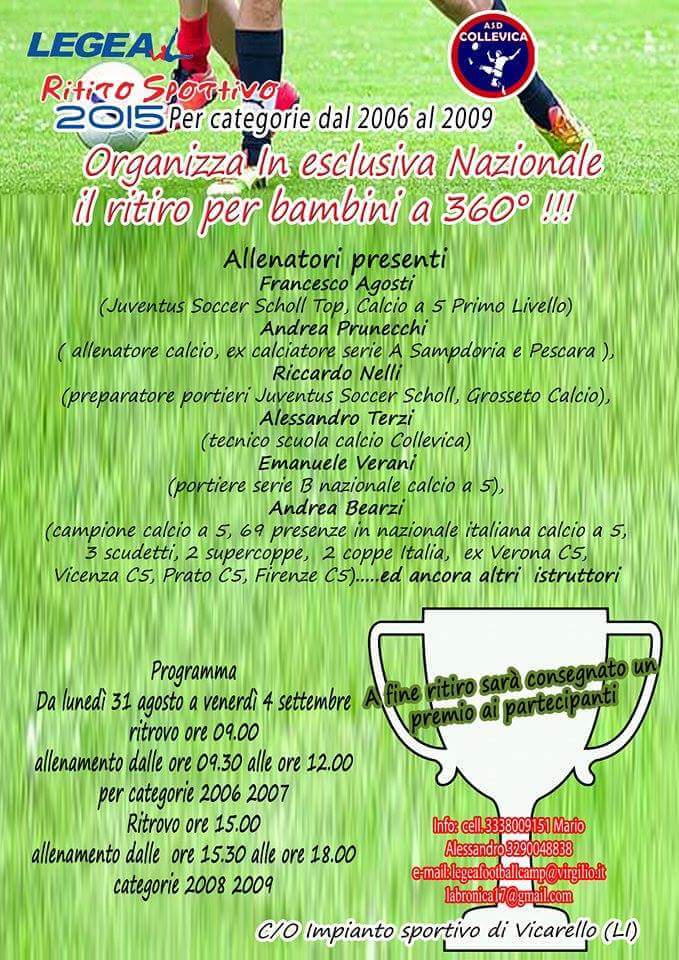 Vicarello Un ritiro a 360 gradi per i bambini delle categorie dal 2006 al 2009. É quanto in programma per lunedì 31 agosto presso il campo sportivo di Vicarello. Il ritrovo per le categorie 2006-2007 è previsto per le 9, mentre l’allenamento inizierà alle 9:30 e durerà fino alle 12. Mentre per quelle 2008-2009 il ritrovo è alle 15 e gli allenamenti dalle 15:30 alle 18.