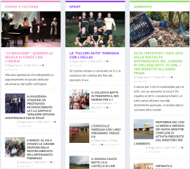 Non è finita qui l’Home Page! Scorrendo ancora sotto è possibile trovare altre tre sezioni (qui si torna ancora alla disposizione verticale): “Eventi e cultura“, “Sport” e “Ambiente“, in cui si trovano le anteprime degli articoli relativi a feste, sagre, mostre, eventi culturali da un lato, ma anche i risultati delle partite delle squadre del territorio e gli articoli relativi a questioni ambientali dagli altri. Anche in questo caso, l’articolo in evidenza ha la foto e il titolo più in grande, quelli sotto, invece, sono a formato più piccolo. Un’altra cosa che balza subito agli occhi sono i nuovi colori che categorizzano gli articoli: azzurro per quelli delle frazioni, arancione per la politica e le notizie del Comune, rosso per la cronaca, rosa per la categoria “eventi e cultura”, viola per lo sport e verde per l’ambiente.