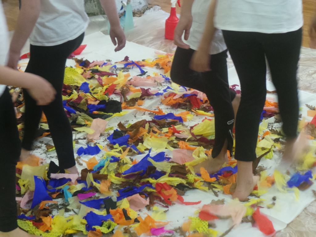 E se il tema della mostra sono le canzoni di Guccini, un riferimento non poteva mancare all’autunno. Al centro della Sala delle Colonne, un telo bianco su cui sono state disposte delle autunnali foglie secche. Sopra queste, dei ritagli colorati per un gioco di colori molto efficace. Coordinate da HDemy, alcune bambine hanno inscenato a piedi nudi una sorta di balletto, su sottofondo musicale, su queste foglie, sparpagliandole in qua e in là.