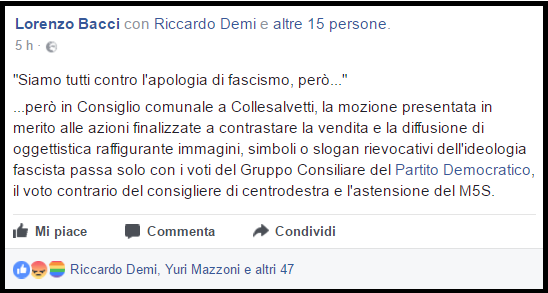 Il dibattito sulla bacheca FB del sindaco Bacci Il dibattito però non si è esaurito in Consiglio Comunale. In un post sulla sua bacheca FB il sindaco Bacci ha scritto: «“Siamo tutti contro l’apologia di fascismo, però…”…Però in Consiglio comunale a Collesalvetti, la mozione presentata in merito alle azioni finalizzate a contrastare la vendita e la diffusione di oggettistica raffigurante immagini, simboli o slogan rievocativi dell’ideologia fascista passa solo con i voti del Gruppo Consiliare del Partito Democratico, il voto contrario del consigliere di centrodestra e l’astensione del M5S».