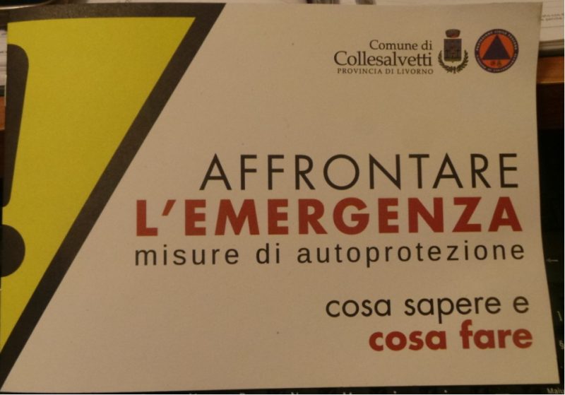 Collesalvetti “Affrontare l’emergenza – Misure di autoprotezione, cosa sapere e cosa fare“. Questo il titolo dell’opuscolo del Comune di Collesalvetti, 21 x 15 cm, in distribuzione presso la cittadinanza. 19 le pagine per 12 capitoletti.