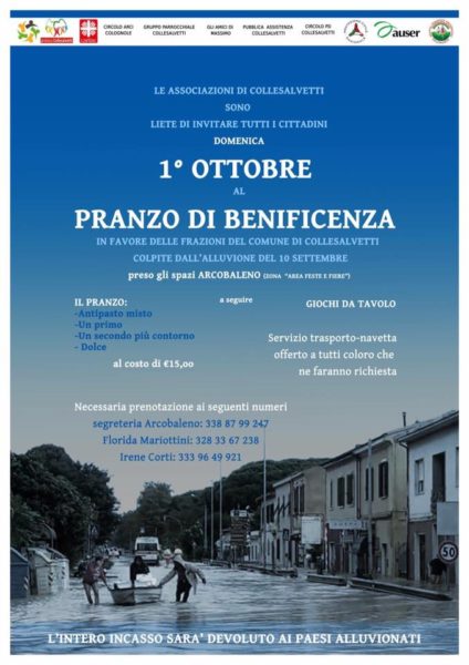 Collesalvetti Un pranzo di beneficenza in favore delle frazioni del Comune di Collesalvetti colpite dall’alluvione del 10 settembre. È quanto organizzato dalle associazioni di Collesalvetti per domenica 1 ottobre. Il pranzo si svolgerà presso l’area feste e fiere della frazione. Il pranzo – al costo di 15 euro – si comporrà di antipasto, primo, secondo, contorno e dolce. Seguiranno giochi da tavolo.