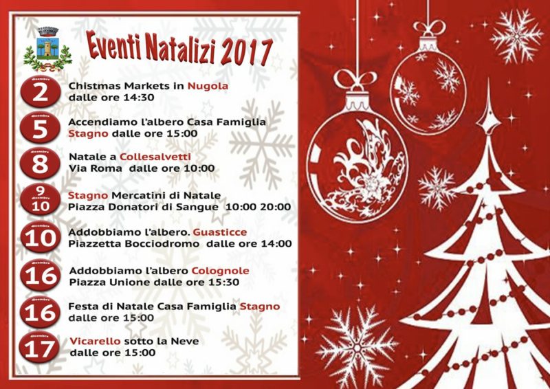 Si inizierà appunto il 2 dicembre con i mercatini di Natale a Nugola (a partire dalle 14:30), per poi proseguire il 5 con l’accensione dell’albero alla Casa Famiglia di Stagno (alle 15). Seguirà l’iniziativa di Collesalvetti l’8 dicembre (l’appuntamento è in Via Roma a partire dalle 10). Il 9 dicembre, ma anche il 10 altro appuntamento a Stagno con i mercatini di Natale (in Piazza Donatori di Sangue: dalle 10 alle 20). E poi Guasticce il 10 dicembre (dalle 14 in poi l’addobbo dell’albero nella piazzetta del bocciodromo). Una terza iniziativa a Stagno, sempre in Casa Famiglia, per la Festa di Natale il 16 dicembre dalle 15:00 e ancora Colognole sempre il 16 con l’addobbo dell’albero (il ritrovo è in Piazza Unione a partire dalle 15:30. Infine “Vicarello sotto la neve” il 17 dicembre dalle 15 in poi.