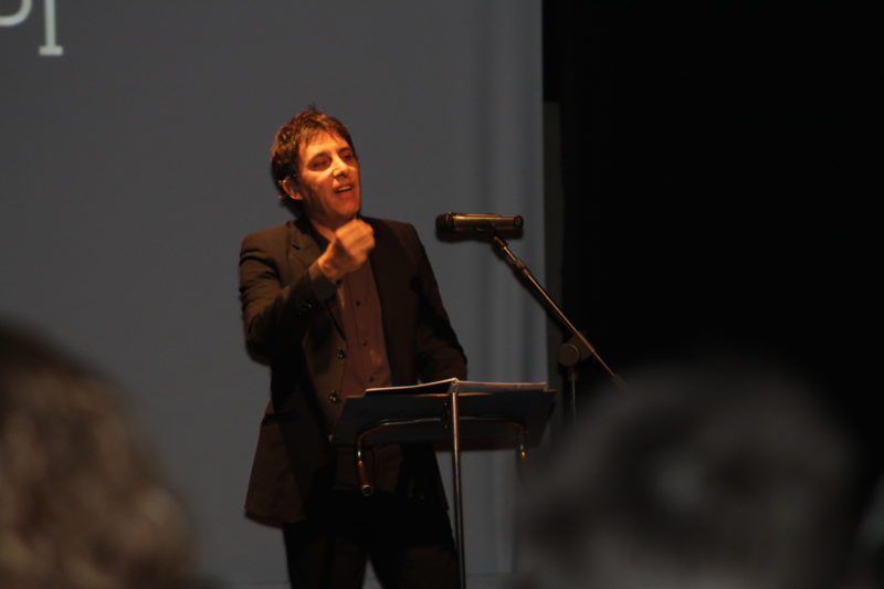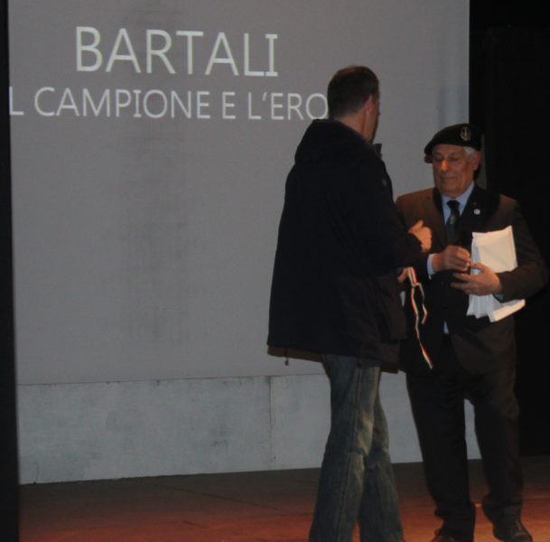 Nel ’43, anno dell’armistizio e del crollo del fascismo, viene contattato dal cardinale Elia Dalla Costa, che a quei tempi faceva parte del Delasem (associazione operante in clandestinità che prestava assistenza agli ebrei e ai perseguitati dal regime nazifascista), che chiede a Gino di svolgere un importante compito: Bartali, compiendo numerosi viaggi dalla stazione di Terontola-Cortona fino ad Assisi avrebbe dovuto trasportare documenti e fototessere nascondendole nei tubi del telaio della bicicletta affinché una stamperia clandestina potesse falsificare dei documenti per permettere alle famiglie ebree rifugiate di fuggire e mettersi in salvo. Così fa; così comincia il periodo di quella che forse è la sua tappa meno famosa ma che sicuramente a livello umano è quella più importante: la Firenze-Assisi-Firenze. Si stima che durante questo periodo grazie all’operato di Bartali si siano potuti mettere in salvo circa 800 cittadini ebrei. Lo spettacolo si è chiuso con la “riproduzione” di un’intervista che Bartali rilasciò nel 1998 al giornalista Giacomo Guerrini, presente ieri in sala e che al termine della rappresentazione scenica è intervenuto sul palco ricordando il momento dell’incontro con il grande campione.