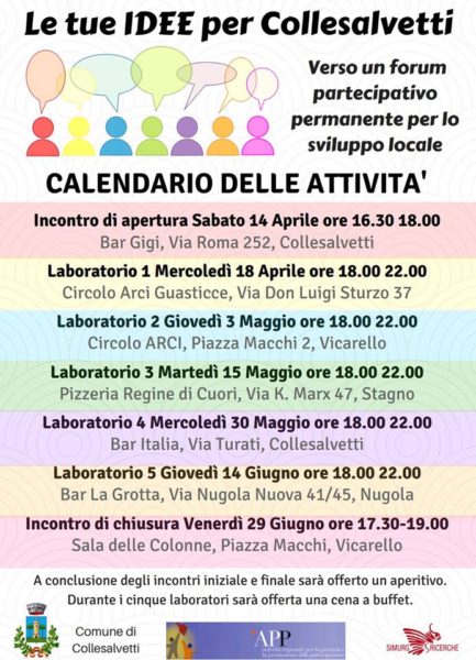 Il primo incontro di presentazione del percorso si svolgerà sabato 14 aprile dalle ore 16:30 alle ore 18:00 presso il Bar Gigi di Collesalvetti, in Via Roma n° 252 e terminerà con un piccolo aperitivo. Il percorso è pensato per favorire al massimo la partecipazione dei cittadini di tutte le età e residenti in ogni frazione. Durante i laboratori ai partecipanti verrà chiesto di individuare in via preliminare su quali temi dovrà lavorare il Forum, come dovrà essere composto e secondo quali regole dovrà funzionare. Sono invitati tutti i cittadini e le associazioni interessati al progetto.