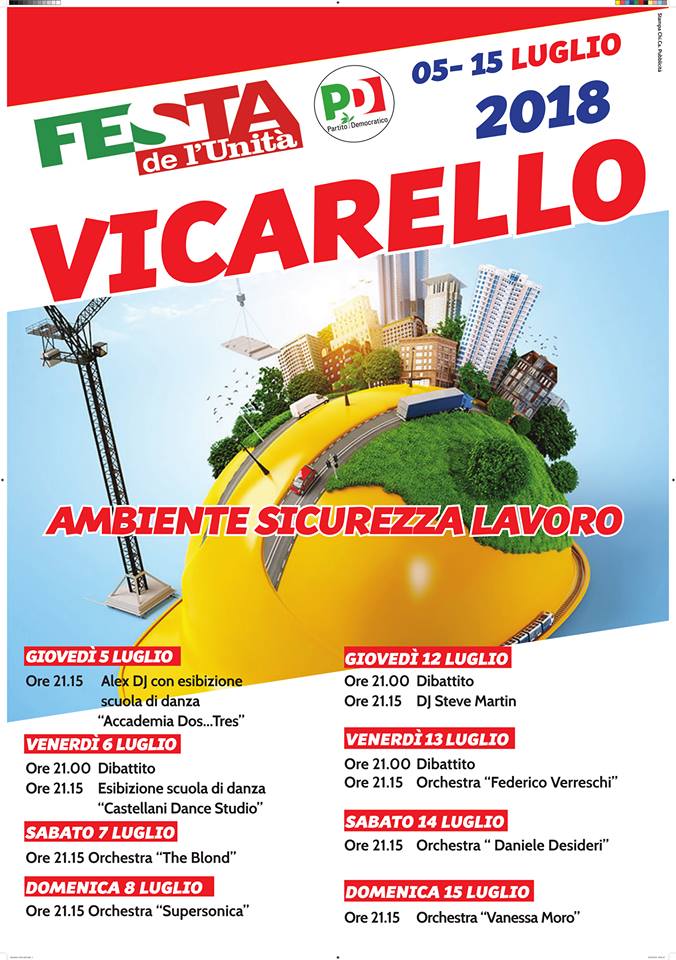 Vicarello Ambiente, sicurezza e lavoro. Saranno i temi cardine dell’edizione 2018 della Festa de l’Unità di Vicarello. La kermesse organizzata dal circolo PD della frazione animerà il paese dal 5 al 15 luglio 2018.