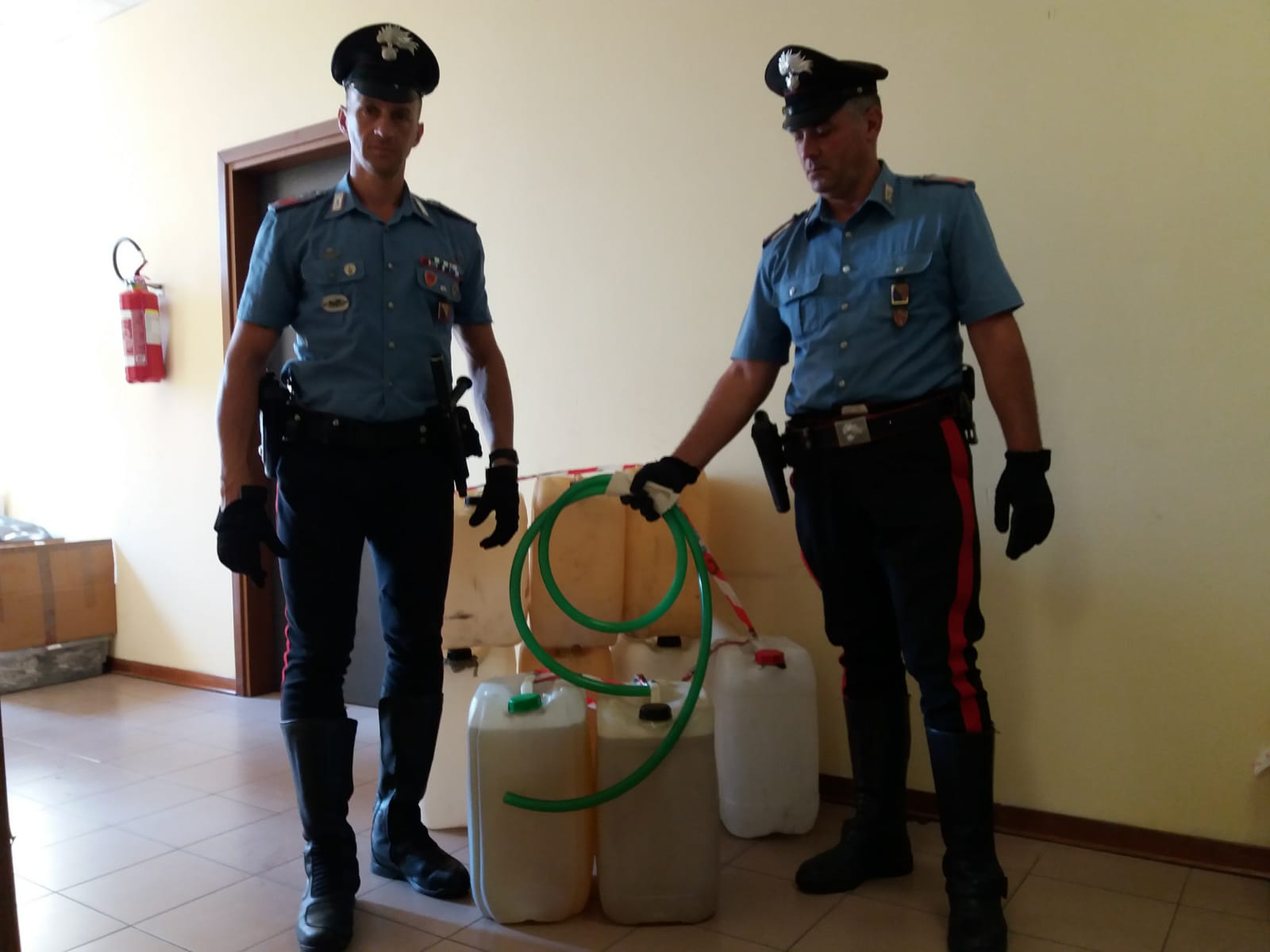 Immediatamente giunti sul posto, i militari hanno individuato i due malfattori, poi risultati marito e moglie, mentre erano ancora intenti ad aspirare 50 litri di gasolio da un autocarro. Sul posto sono state rinvenute altre 9 taniche, una rudimentale pompa di aspirazione e un tubo in plastica, nonché l’automobile della coppia parcheggiata poco lontano. Accompagnati presso gli uffici del comando della Compagnia, i coniugi sono stati denunciati in stato di libertà per furto.