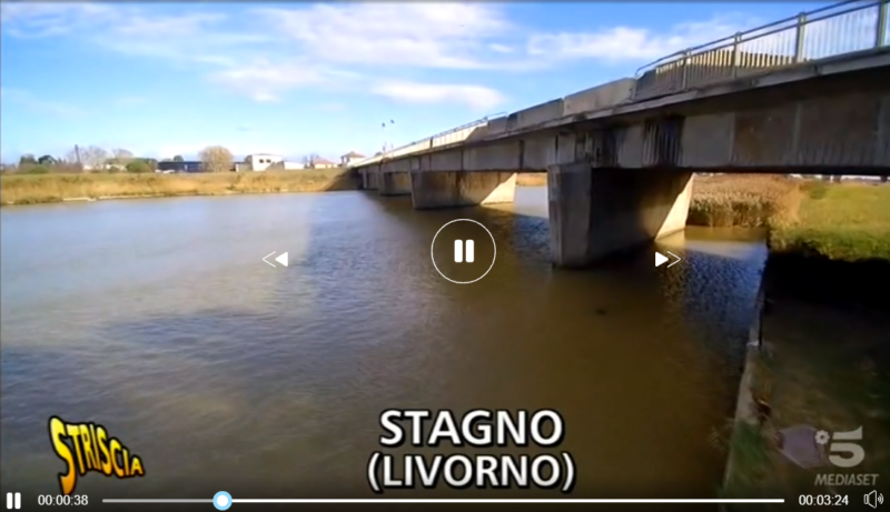 «Ci hanno segnalato questo viadotto – esordisce l’inviata – lungo la Via Aurelia che sembrerebbe aver bisogno di un urgente restauro». Le fa seguito lo stagnino Stefano Biagi: «Noi cittadini siamo molto preoccupati: questo ponte, come potete vedere, è in condizioni precarie e la nostra grande preoccupazione è che possa cedere, che possa venire giù. Qua intorno ci sono grandi aziende, grandi complessi industriali…». Ribatte l’inviata: «Ed essendoci delle aziende, immagino che sia transitato da mezzi pesanti…» (nel frattempo scorrono le immagini del transito di tir).
