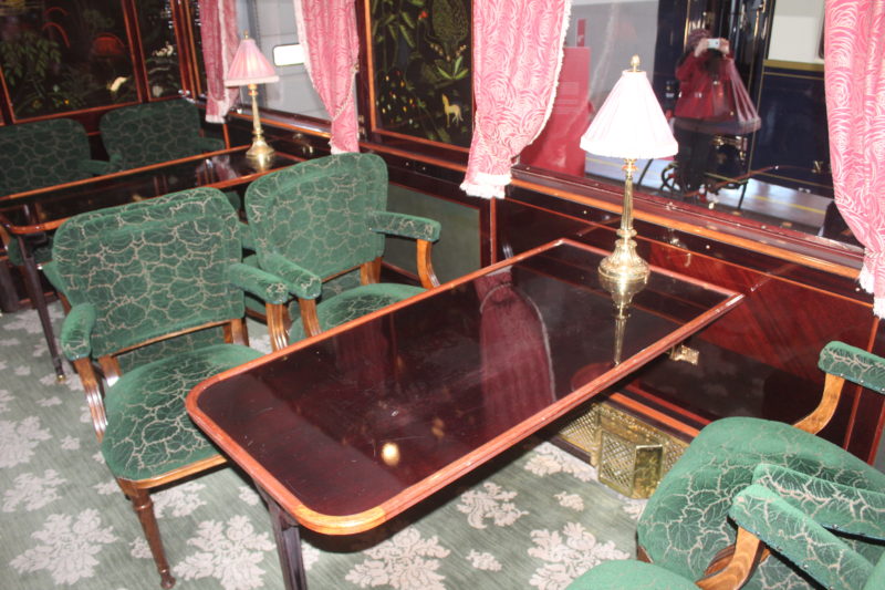 E ancora: l’elegantissimo vagone bar, che vede in cima alla carrozza una cartina politica d’Europa. All’interno, il classico bancone da bar e gli immancabili tavolinetti con abat-jour con comode poltroncine imbottite e divanetti. E, per allietare i passeggeri, un pianoforte a coda (per l’occasione dell’Open Day guasticciano appositamente suonato da un pianista). Nata inizialmente come vagone ristorante, la carrozza 3674 fu costruita in Francia nel 1931. Gli interni attuali sono stati progettati appositamente per il Venice Simplon Orient Express. Nel suo trascorso ci sono tratte di servizio nazionali durante l’invasione tedesca in Francia. Dopo la guerra fu collegato al Sud Express da Parigi a Irun sul confine spagnolo. Nel 1977 James Sherwood acquistò due degli originali vagoni letto all’asta di Sotheby a Monaco.