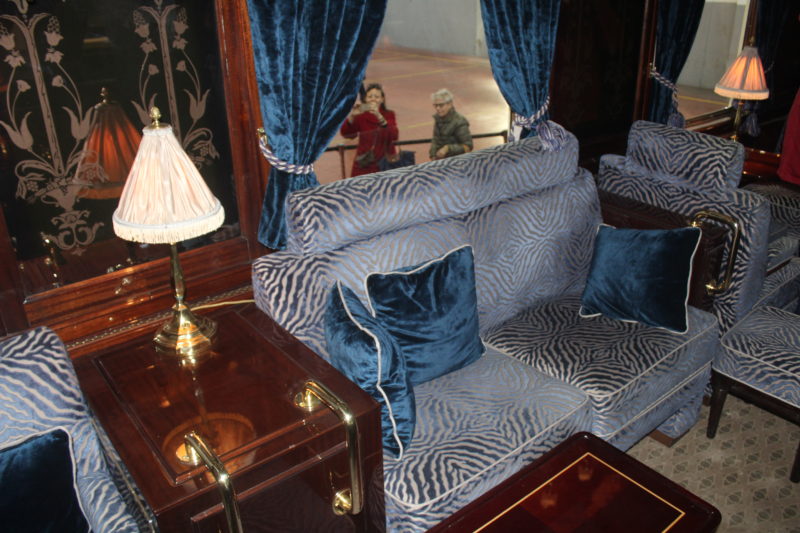 Ma c’era anche il vagone ristorante con le cucine in cima alla carrozza. Per terra una moquette e in verticale non mancano delle decorazioni intarsiate. Ovviamente, presenti numerosi tavolinetti con abat jour e comode poltroncine. Ai finestrini, tendine in stoffa, mentre sopra dei porta-oggetti in ottone. Sul soffitto de vagone degli eleganti ventilatori. Il vagone ristorante 4095 in origine era una carrozza adibita a cucina costruita a Birmingham nel 1927 nello stile dell’Étoile du Nord. Prima del suo restauro, realizzato con lo scopo di unirla al Venice Simplon Orient Express, è stata agganciata a diversi treni. Nel 1929 la carrozza 4095 è stata collegata al Cote d’Azur Pullman Express, un elegante treno partito da Parigi alla volta di Nizza e Mentone divenuto simbolo dei “ruggenti anni venti” proprio come il Train Bleu. Ma anche un altro vagone ristorante, il 4141, progettato per questo servizio da René Lalique, faceva parte di questo treno.