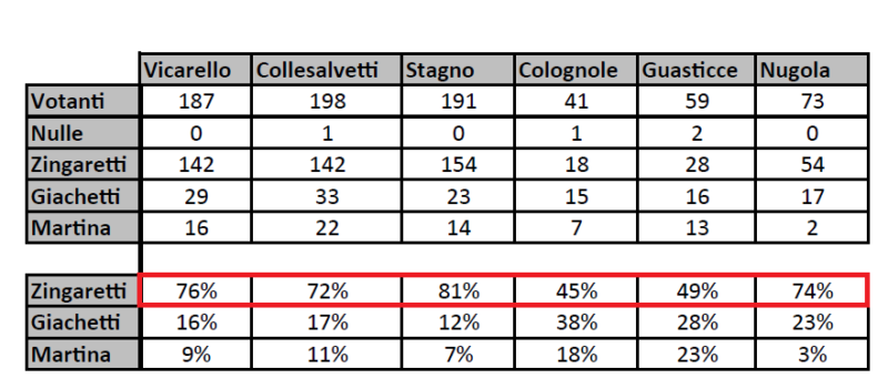 IL VOTO NELLE FRAZIONI COLLIGIANE ha ricalcato il trend nazionale con Zingaretti che è riuscito ad imporsi nei seggi di Collesalvetti, Stagno, Vicarello e Nugola. Sotto al 50% invece a Guasticce e Colognole (la ripartizione dei seggi non era identica a quella delle altre elezioni, leggi qui). Questi i dati dei seggi delle primarie: