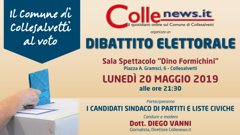 Collesalvetti Un dibattito elettorale con i vari candidati alla carica di sindaco del Comune di Collesalvetti. È quanto organizza questa testata giornalistica, Collenews.it in vista delle elezioni amministrative che interesseranno anche il Comune colligiano. Al momento hanno confermato la loro partecipazione al dibattito tutti i candidati: Adelio Antolini (PD, Collesalvetti Civica, PSI e MDP); Ornella Berretta (Forza Italia, Lega e Fratelli d’Italia); Daniele Rossi (Movimento Cinque Stelle); Emanuele Marcis (lista civica Cittadini in Comune per Collesalvetti); Luca Chiappe (La Sinistra di Collesalvetti), Vittorio Rocchi (Democrazia Indipendente) e Stefano Friani (PCI). Il dibattito sarà condotto e moderato dal direttore di Collenews.it, Diego Vanni.
