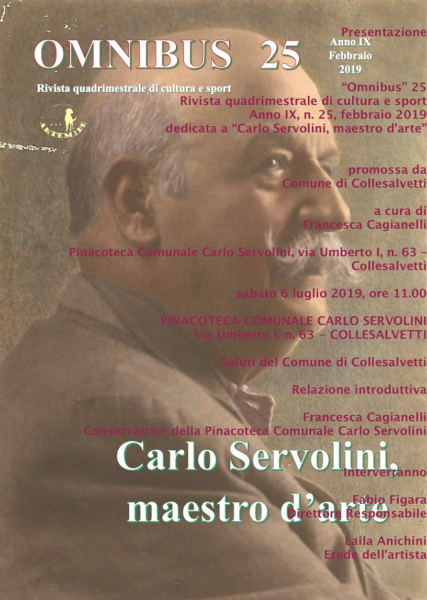 Collesalvetti Nella cornice del “Museo Rinnovato. Percorso espositivo 2019”, promosso dal Comune di Collesalvetti, ideato e curato da Francesca Cagianelli, sabato 6 luglio 2019, alle 11:00, alla Pinacoteca Comunale “Carlo Servolini“, si terrà la presentazione di “Omnibus 25”, rivista quadrimestrale di cultura e sport, anno IX, n. 25, febbraio 2019, dedicata a “Carlo Servolini, maestro d’arte”.