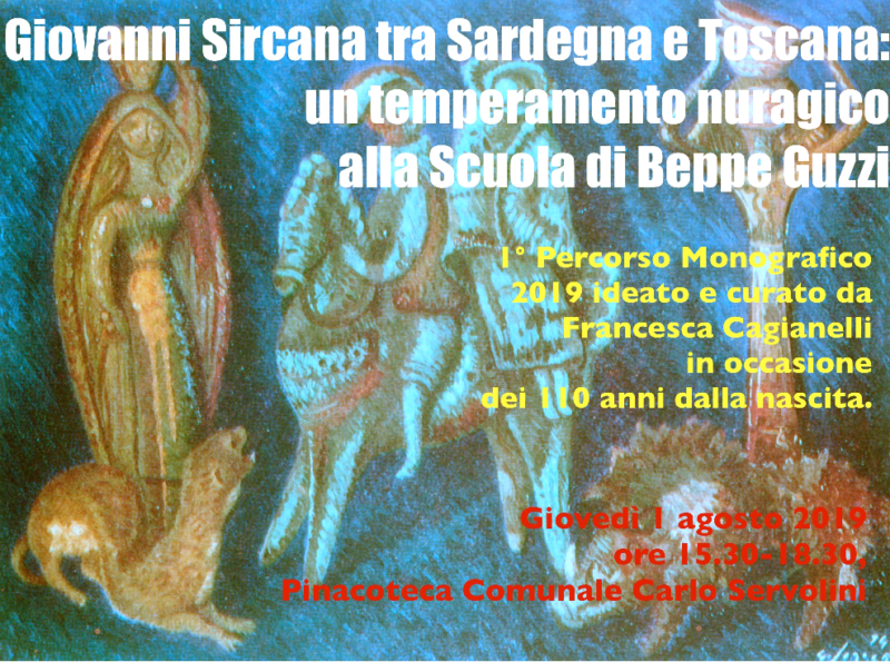 Collesalvetti Giovedì 1° agosto 2019, ore 15:30-18:30, ultimo giorno di apertura della Pinacoteca Comunale “Carlo Servolini prima della pausa estiva, nell’ambito del progetto di valorizzazione e promozione del Museo Rinnovato e delle Donazioni va in onda il 1° Percorso Monografico 2019 dal titolo “Giovanni Sircana tra Sardegna e Toscana: un temperamento nuragico alla Scuola di Beppe Guzzi, ideato e curato da Francesca Cagianelli in occasione dei 110 anni dalla nascita”.