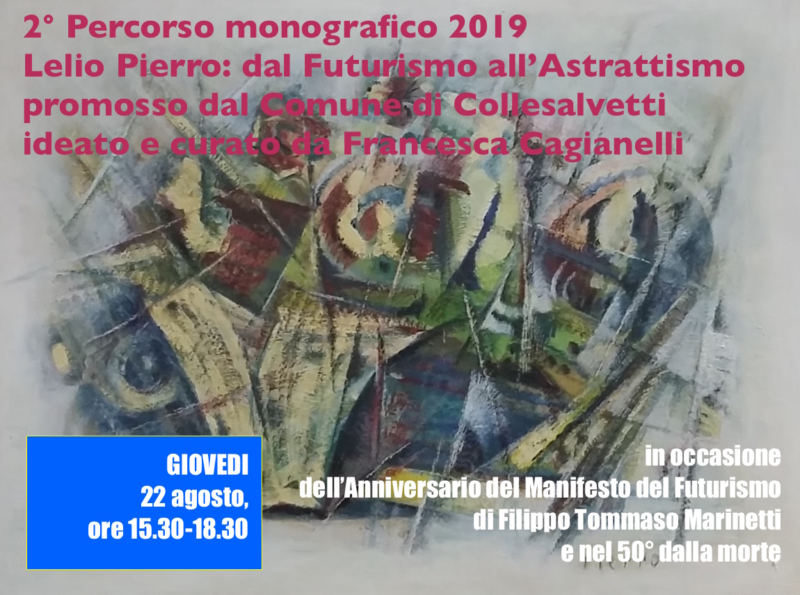 Collesalvetti Riapre la Pinacoteca Comunale “Carlo Servolini“. Il giorno della riapertura è fissato per giovedì 22 agosto, ore 15:30-18:30, con il 2° Percorso monografico 2019 dal titolo Lelio Pierro: dal Futurismo all’Astrattismo, promosso dal Comune di Collesalvetti, ideato e curato da Francesca Cagianelli, in occasione dell’anniversario del Manifesto del Futurismo di Filippo Tommaso Marinetti e nel 50° dalla morte.