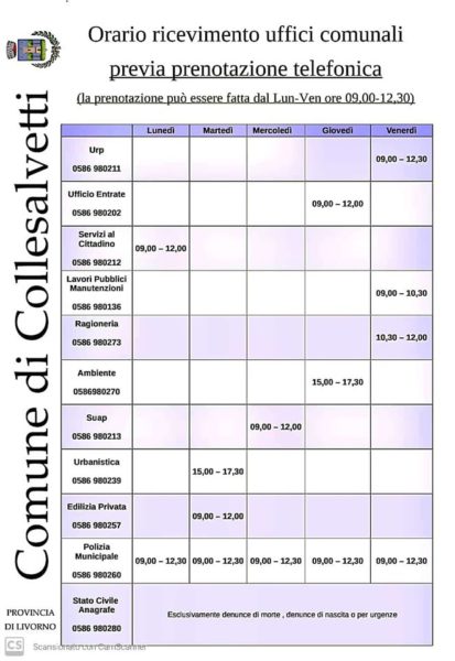 Collesalvetti Da oggi, lunedì 11 maggio riaprono gli uffici comunali. Ma dal Municipio colligiano informano che l’apertura sarà solo previo appuntamento, da concordare telefonicamente ai numeri indicati in questo file (Orari ricevimenti UFFICI COMUNALI).