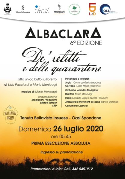 Guasticce Torna anche quest’anno l’Alba Clara, lo storico format che da anni si inserisce nelle manifestazioni dedicate alla Liberazione di Collesalvetti e che fa il paio con la Notte Clara. L’appuntamento, per gli interessati, è rigorosamente per gente molto mattiniera: alle 05:45. Del resto… si tratta di vedere l’alba in musica. Quest’anno andrà in scena De’ relitti e delle quarantene”: un lavoro di Mario Menicagli su libretto scritto a quattro mani dal poeta colligiano Lido Pacciardi e dallo stesso Menicagli. I protagonisti sono Carlo Morini (Gervasio) e Costanza Gallo (Argia), una coppia di sposi anziani che trascorre la quarantena tra litigate e incomprensioni.