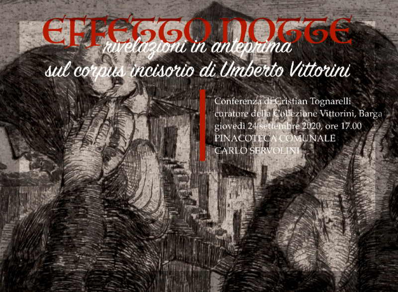 Ed è a Umberto Vittorini (Barga, Lucca, 1890 – Milano, 1979) che sarà dedicata la puntata inaugurale dal titolo “Effetto Notte: rivelazioni in anteprima sul corpus incisorio di Umberto Vittorini”, tenuta da Cristian Tognarelli, curatore della Collezione Vittorini Barga, in onda giovedì 24 settembre 2020, ore 17:00, concepita come una vera e propria anticipazione della mostra programmata dal Comune di Collesalvetti per la fine del 2020 e messa in campo per celebrare il rientro in Pinacoteca del dipinto “Paesaggio con case” appartenente alle raccolte del Comune di Collesalvetti.
