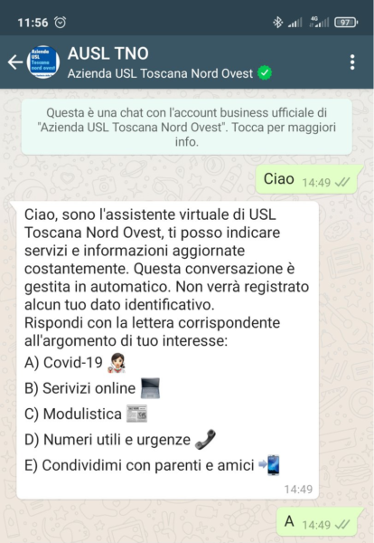 Collesalvetti “Usare WhatsApp per dare informazioni affidabili, puntuali e accurate sull’emergenza Covid, 24 ore su 24, a portata di mano sullo smartphone di ogni cittadino. Lo fa, per prima in Italia nell’ambito delle aziende sanitarie, l’Azienda USL Toscana Nord Ovest, che, dal 27 novembre, sperimenta un nuovo servizio di assistenza virtuale su WhatsApp (una “chatbox”), per rispondere alle domande più frequenti sull’emergenza Covid“. A darne notizia la stessa ASL, dalla quale spiegano: “utilizzarlo è semplice: basta salvare il numero 050 954666 tra i propri contatti e inviare al numero un messaggio con la parola Ciao. L’assistente virtuale si attiverà indicando una serie di opzioni tra cui scegliere per ottenere una risposta immediata“.