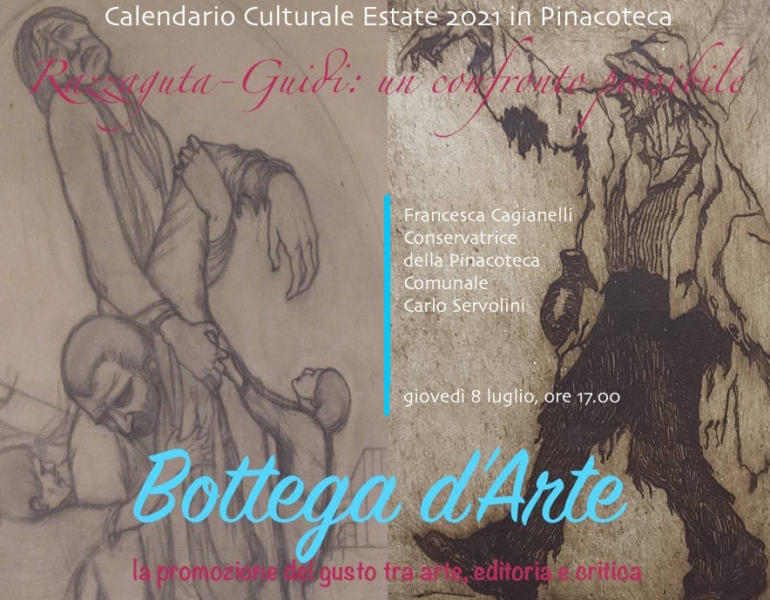 A celebrare questo emblematico dialogo artistico tra due protagonisti della stagione di “Bottega d’Arte”, sopraggiungerà, giovedì 22 luglio, la 4° Puntata del Calendario dal titolo “Omaggio a Giuseppe Guidi nel centesimo anniversario del Vittoriale degli Italiani”, in collaborazione con il Museo Civico di Castel Bolognese, a cura di Martina Fabbri Nuccitelli, storica dell’arte, operatrice del Museo Civico di Castel Bolognese. Esito entusiasmante della collaborazione instauratasi tra la Pinacoteca Comunale “Carlo Servolini” e il Museo Civico di Castel Bolognese, grazie anche alla cortese partecipazione dello scultore Alberto Mingotti, l’intervento di Martina Fabbri Nuccitelli sarà l’occasione per delineare un appassionante e insondato scenario di prospettive storiografiche entro le quali rivedere le sorti di Gastone Razzaguta e Giuseppe Guidi.