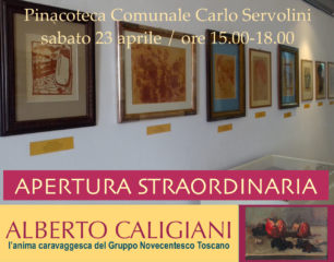 Collesalvetti A seguito delle prenotazioni pervenute la Pinacoteca Comunale “Carlo Servolini” ha il piacere di annunciare la 1^ Apertura Straordinaria in occasione della mostra “Alberto Caligiani: l’anima caravaggesca del Gruppo Novecentesco Toscano”, promossa dal Comune di Collesalvetti, ideata e curata da Francesca Cagianelli, in collaborazione con gli eredi dell’artista: Marco, Stefano e Paolo Moschi, Carla Pii e Lucia Caligiani (ingresso gratuito, fino al 14 luglio 2022, tutti i giovedì, ore 15:30-18:30 e su prenotazione per piccoli gruppi: 0586.980251/252 e 3926025703), in programma sabato 23 aprile 2022, ore 15.00-18.00.