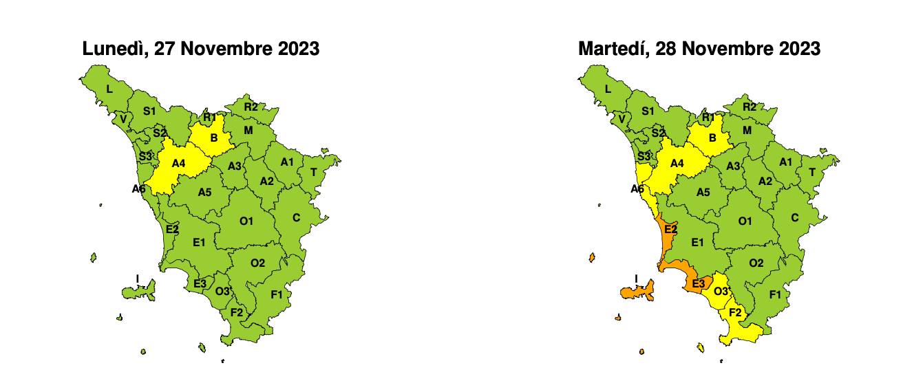 Collesalvetti , 27 novembre 2023 – Una vasta perturbazione in transito sulla Toscana, con forti venti e mare molto agitato, specialmente nelle zone costiere centro-meridionali e insulari. Per questo Sala operativa della Protezione civile regionale ha emesso un’allerta meteo di colore arancione per forti temporali e rischio idrogeologico-idraulico a partire dalle ore 7.00 fino alle 18.00 di martedì 28 Novembre per i tratti della costa centro-meridionale della regione, per l’Isola d’Elba e l’Arcipelago Toscano. Allerta gialla invece per vento forte e rischio mareggiate su costa grossetana e livornese, valido dalle ore 20 di oggi fino alle 7 di domani, in particolare per le aree di costa comprese tra i bacini di Bisenzio e Ombrone Pistoiese e del Valdarno Inferiore.