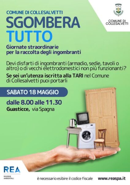 L’evento “Sgombera Tutto” garantirà agli utenti iscritti all’anagrafe Tari nel Comune di Collesalvetti di liberarsi in modo corretto e responsabile di materiali di vario genere, quali tavoli, sedie, armadi, mobilia e vecchi elettrodomestici. Il punto di raccolta mobile sarà appositamente allestito in Via Spagna a Guasticce, pronto ad accogliere i cittadini desiderosi di contribuire alla pulizia e all’ordine del proprio territorio.