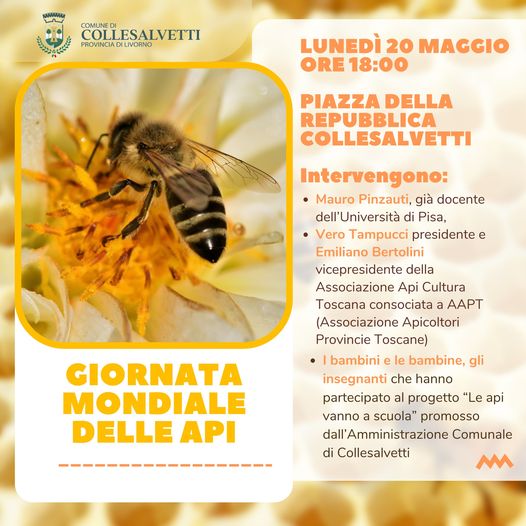 Collesalvetti.  Piazza della Repubblica  sarà il fulcro di un evento dedicato alla Giornata Mondiale delle Api. L’appuntamento è alle ore 18:00 di lunedì 20 maggio, data che dal 2017 è stata scelta dall’Assemblea generale delle Nazioni Unite  in coincidenza del giorno di nascita dell’allevatore sloveno Anton Janša, ricordato come il pioniere dell’apicoltura razionale.