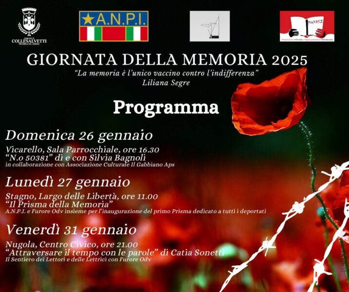 Le celebrazioni si concluderanno venerdì 31 gennaio, alle ore 21.00, al Centro Civico di Nugola, dove Furore Odv presenterà il libro “Attraversare il tempo con le parole” di Catia Sonetti. Il volume ricostruisce la fitta corrispondenza di una famiglia ebraica livornese dal 1937 al 1947, un decennio cruciale per la storia mondiale (ed. il Mulino), offrendo un ulteriore momento di riflessione sul passato e sulla necessità di non dimenticare.