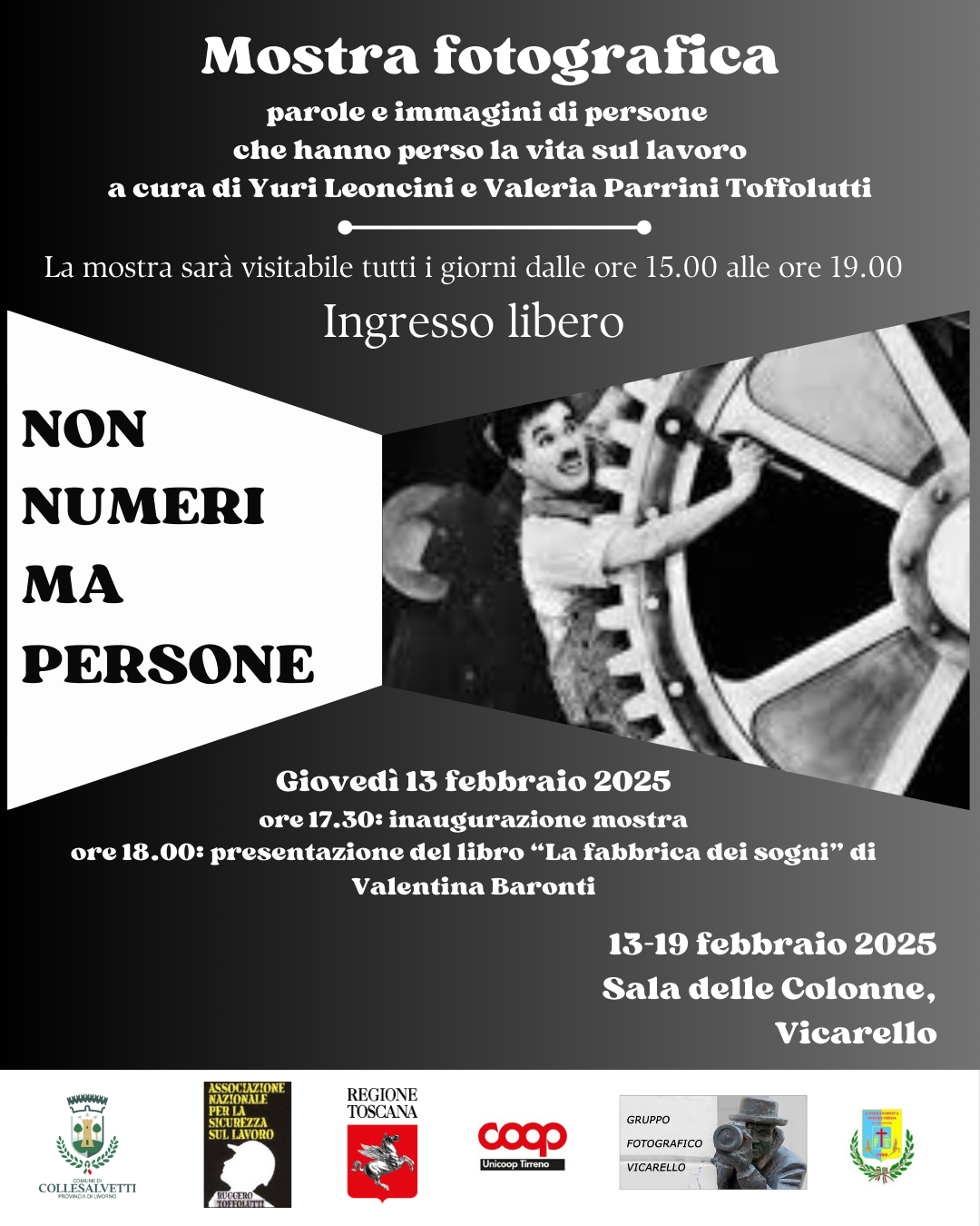 Sarà inaugurata giovedì 13 febbraio, alle ore 17.30, nella cornice della Sala delle Colonne di Vicarello, la mostra fotografica “Non Numeri ma Persone“, un racconto per immagini dedicato a coloro che hanno perso la vita sul luogo di lavoro. Promossa dal Comune di Collesalvetti e ideata dall’Associazione Nazionale per la Sicurezza sul Lavoro “Ruggero Toffolutti”, l’esposizione porta la firma curatoriale di Yuri Leoncini e Valeria Parrini Toffolutti.