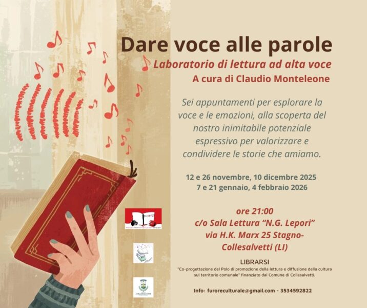 Stagno — Tornano gli appuntamenti di Librarsi, il progetto promosso dal Comune di Collesalvetti per diffondere la lettura e valorizzare la cultura come pratica condivisa. Nell’ambito dell’iniziativa, l’associazione culturale Furore OdV propone un laboratorio di lettura ad alta voce condotto da Claudio Monteleone, autore, attore, regista e illustratore livornese, figura poliedrica capace di unire le arti della scena e della parola.