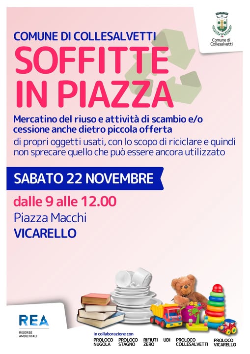 COLLESALVETTI – Torna Soffitte in piazza, l’iniziativa dedicata al riuso e al baratto che invita i cittadini a dare nuova vita agli oggetti dimenticati. L’appuntamento è per sabato 22 novembre, dalle 9 alle 12, in piazza Macchi a Vicarello.